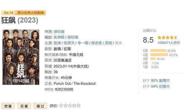 当先,让咱们来望望备受温文的豆瓣评分。《狂飙》播出后,其评分一起攀升,最高时达到了9.0分。诚然现时踏委果8.5分,但仍然是国产剧中的杰出人物,与《觉悟年代》、《山海情》等优秀作品比肩。逾越50万东谈主的评分也充办法释了它的受宽贷进程。