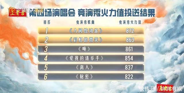 四公追溯, 1.《东谈主间惊鸿客》872票 2.《彩虹的浅笑》863票 3.《唤》862票 4.《爱我的请举手》854票 5.《离东谈主》837票 6.《微妙》822票 我的个东谈主评价,东谈主间惊鸿客、爱我的请举手=唤、离东谈主、彩虹的浅笑、微妙。四公相同莫得迥殊差的舞台,全员上桌。
