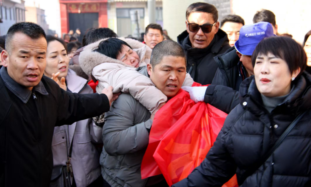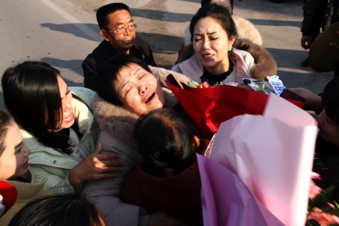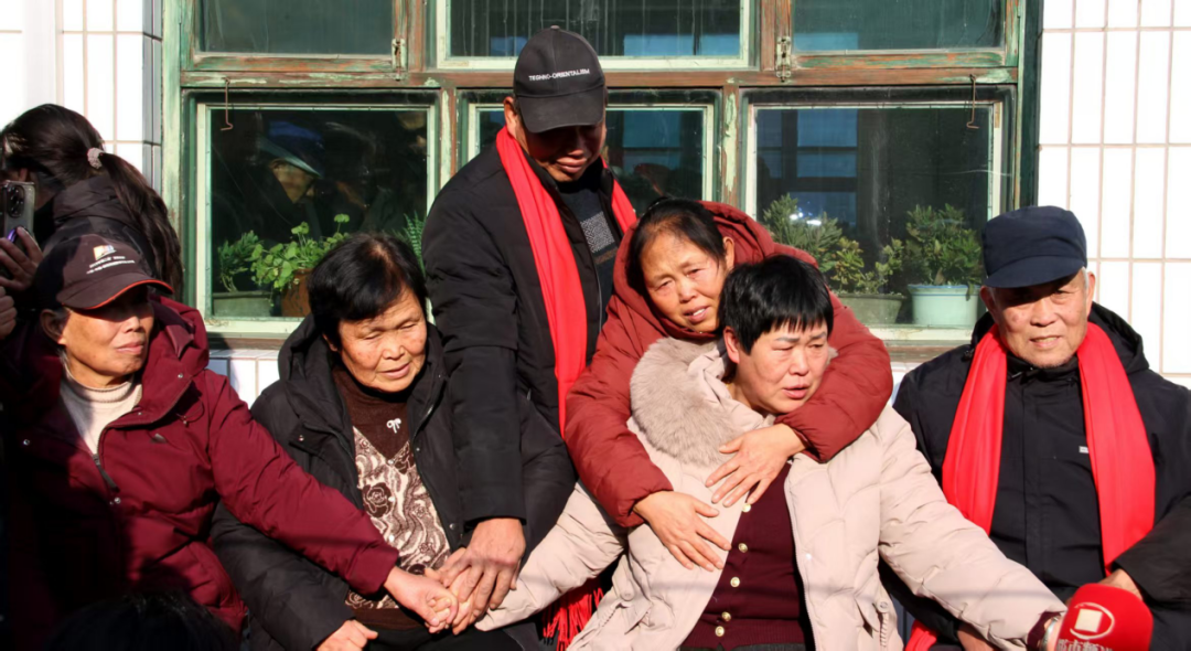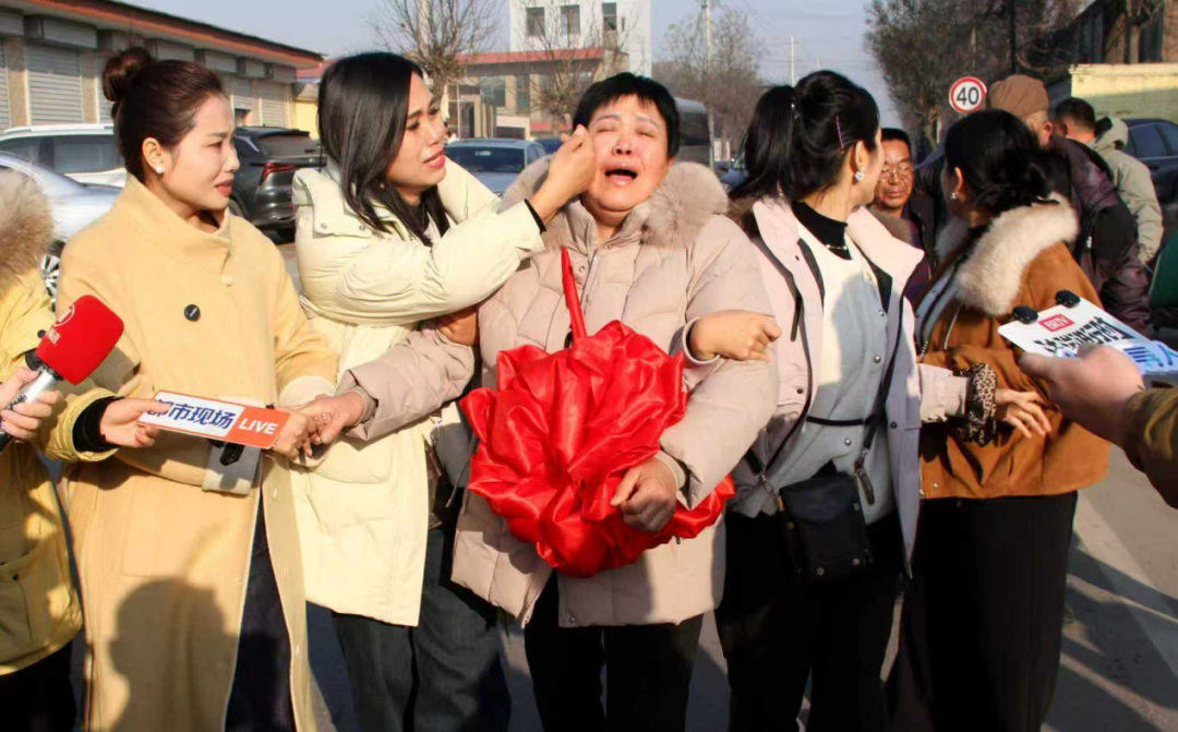 认亲现场,颉巧芳(左三)我晕后,外甥背起她