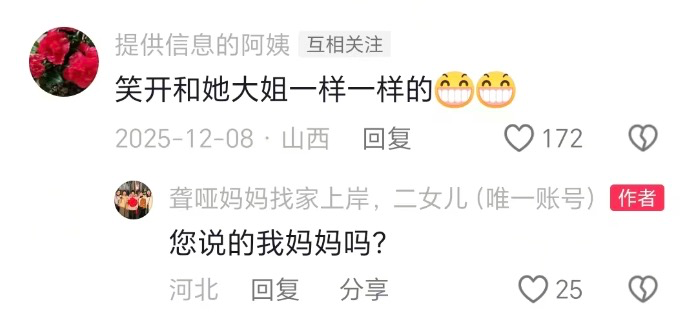 2025年12月7日下昼,“平缓快慰”在我方的视频驳斥区发现了网友@淡定 的留言:在山西晋中祁县祁城村,邻居家丢过一个女孩,亦然聋哑东谈主。他赶快介入,将从@淡定 那里赢得的像片发给颉巧芳辩认。